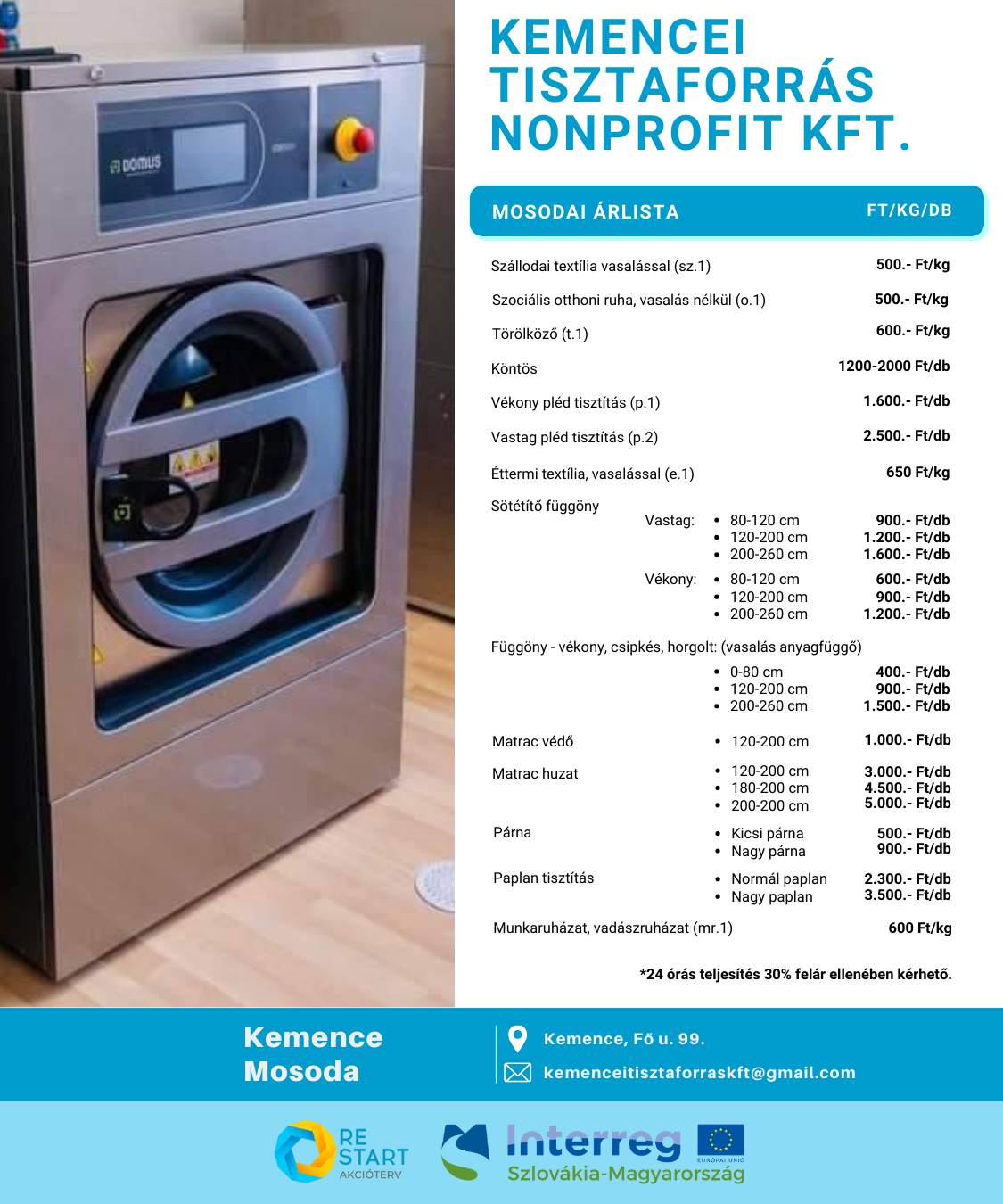 Kemencei Tisztaforrás Nonprofit Kft. új mosodai árlistát hozott létre, mely az alábbi linken letöthető és megtekinthető.