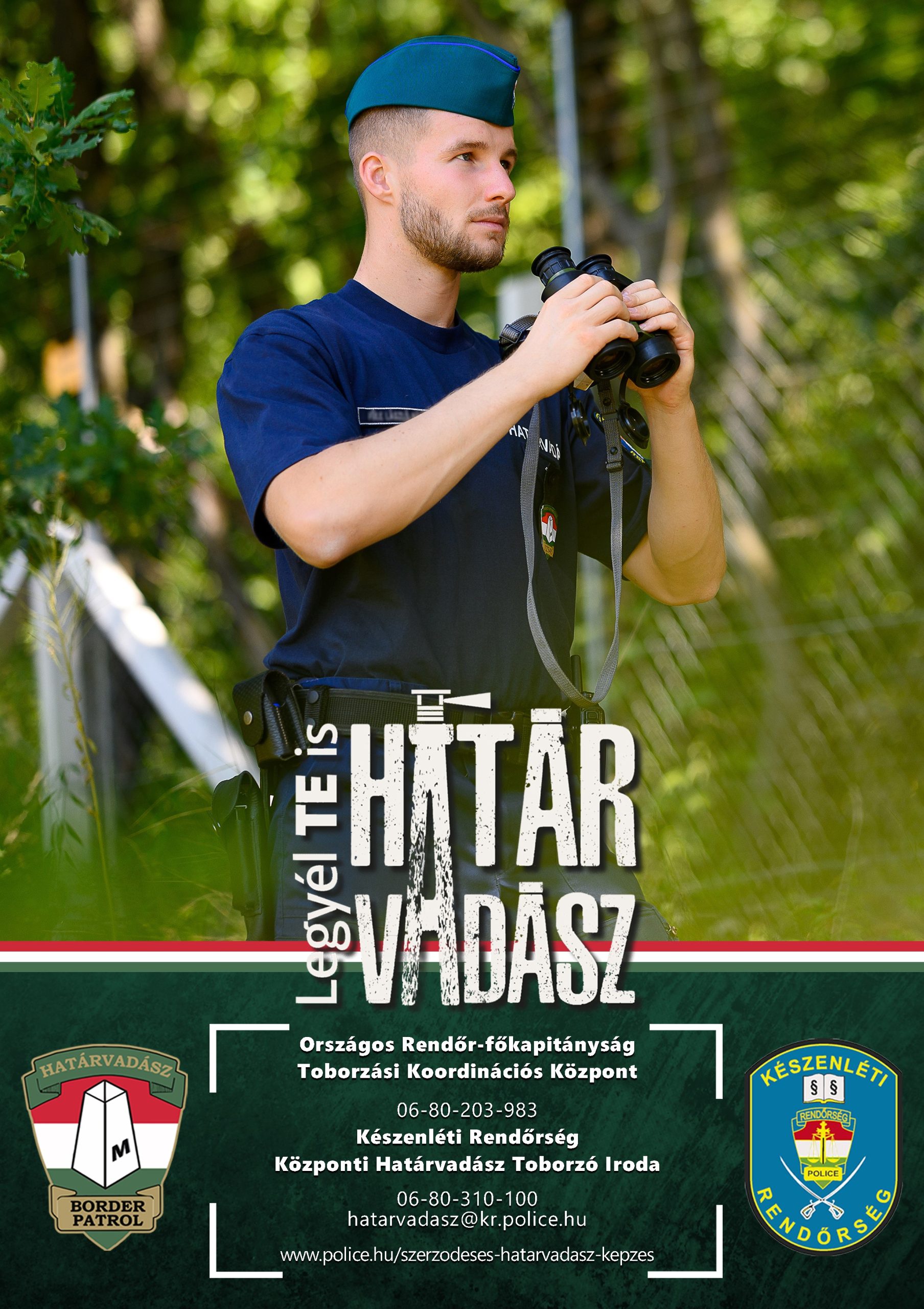 Országos Rendőr-főkapitányság Toborzási Koordinációs Központ 06-80-203-983 Készenléti Rendőrség Központi Határvadász Toborzó Iroda 06-80-310-100 hatarvadasz@kr.police.hu További információk: www.police.hu/szerzodeses-hatarvadasz-kepzes