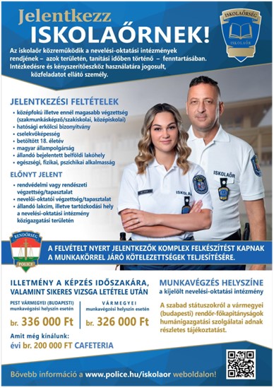 Az iskolaőr közreműködik a nevelési-oktatási intézmények rendjének fenntartásában, megakadályozza az intézményi dolgozók, valamint a tanulók biztonságát sértő vagy veszélyeztető cselekményeket, biztosítja a zavartalan munkavégzést. Jelentkezési feltételek: középfokú végzettség (minimum érettségi); büntetlen előélet; cselekvőképesség; betöltött 18. életév; magyar állampolgárság; állandó bejelentett belföldi lakóhely; egészségi alkalmasság. További információk és jelentkezés: www.karrier.police.hu