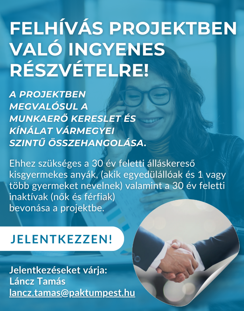 A projektben megvalósul a munkaerő kereslet és kínálat vármegyei szintű összehangolása. Ehhez szükséges a 30 év feletti álláskereső kisgyermekes anyák, (akik egyedülállóak és 1 vagy több gyermeket nevelnek) valamint a 30 év feletti inaktívak (nők és férfiak) bevonása a projektbe. Kérjük, hogy amennyiben Ön is a fenti célcsoportba tartozik, legyen kedves jelentkezni Láncz Tamásnál, a paktumiroda munkatársánál a lancz.tamas@paktumpest.hu E-mail címen, vagy a megbízott családsegítő vagy szociális ügyekkel foglalkozó kapcsolattartó munkatársnál! A felhívás bővebb leírása és részletei az alábbiakban letölthető dokumentumban olvasható! Kérjük töltse le a bővebb tájékoztatásért!