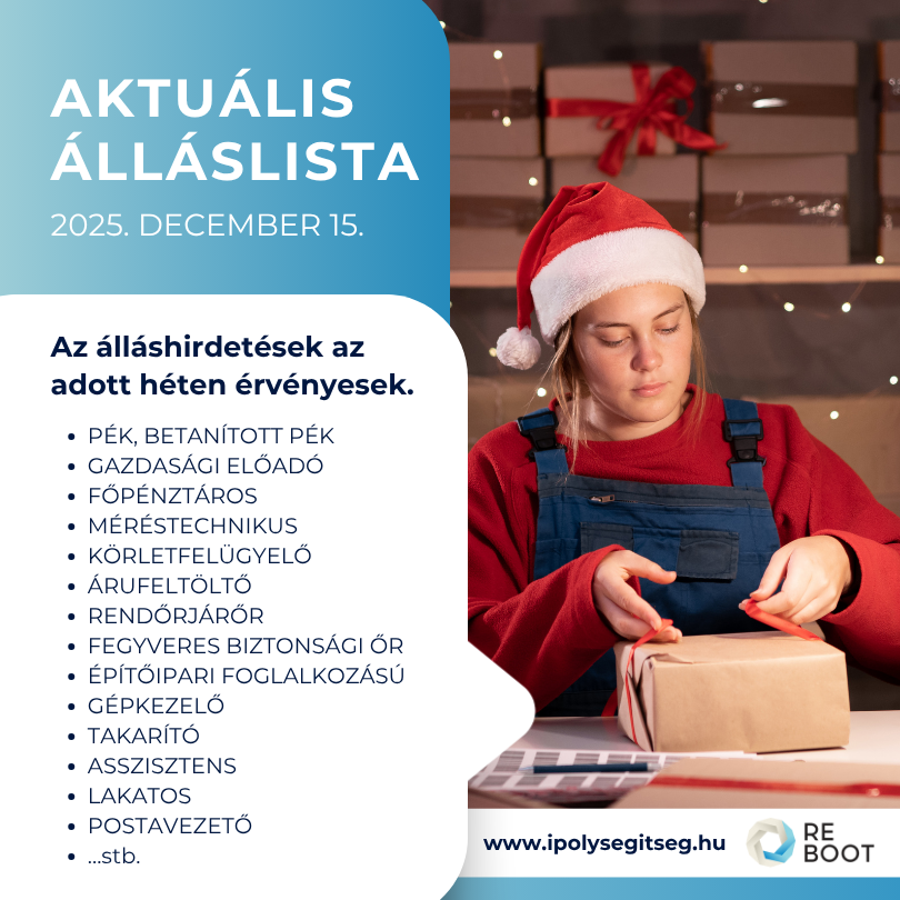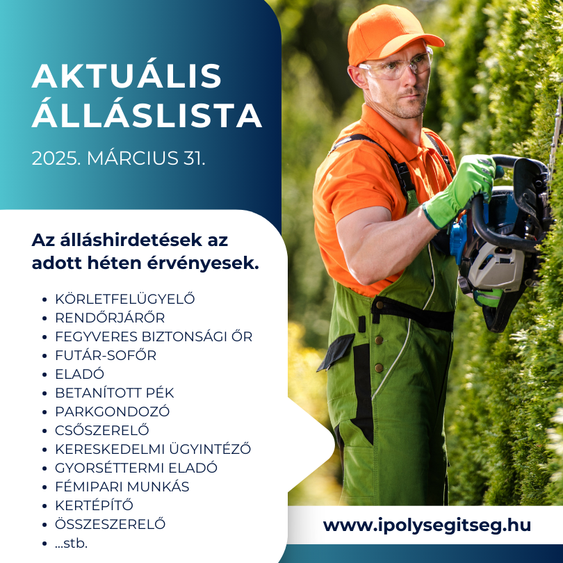 Az álláshirdetésekaz aktuális héten érvényesek. Tekintse meg az aktuális álláslistát az alább letölthető dokumentumban!